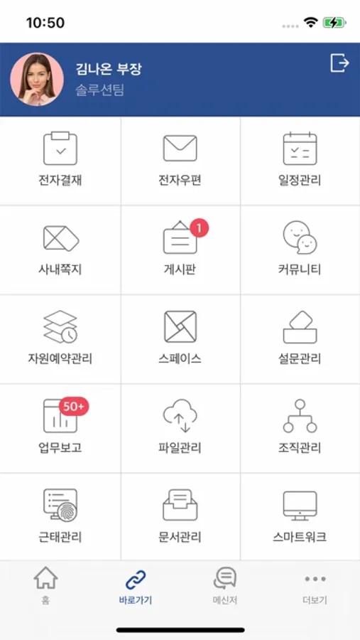 - 사진이나 문서를 첨부할 수 있으며 QR 인식기를 내장하고 있습니다. 또한 푸쉬알림 기능을 통해 결재알림등
