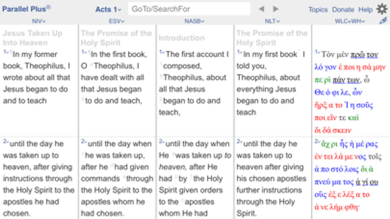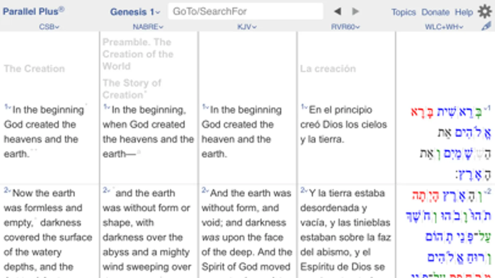 The PARALLEL PLUS® Bible-study app is for pastors, lay leaders, and others actively seeking a deeper understanding of the Scriptures. PARALLEL: up to 7 columns, 170+ versions. PLUS Greek and Hebrew word studies (verse lists, unabridged Thayer/BDB/Schleusner, word families). PLUS exegetic helps (parsings, translation tips). Free, online only, install now.