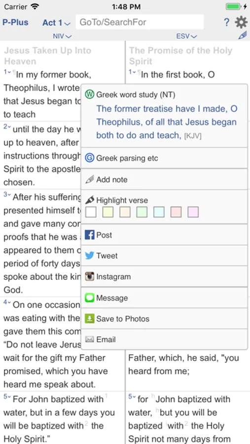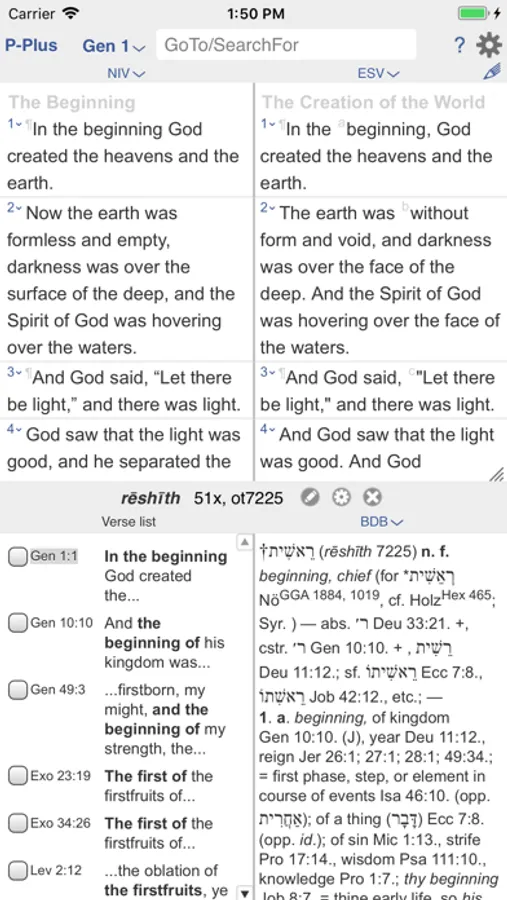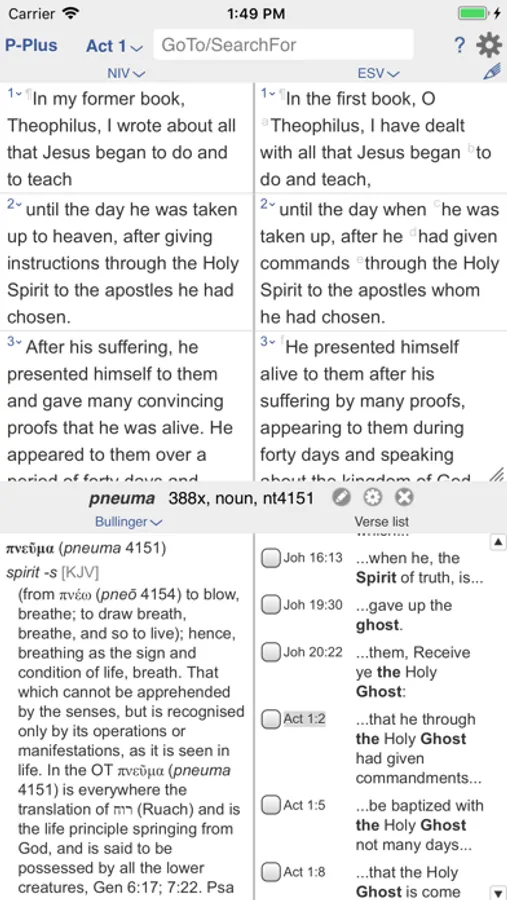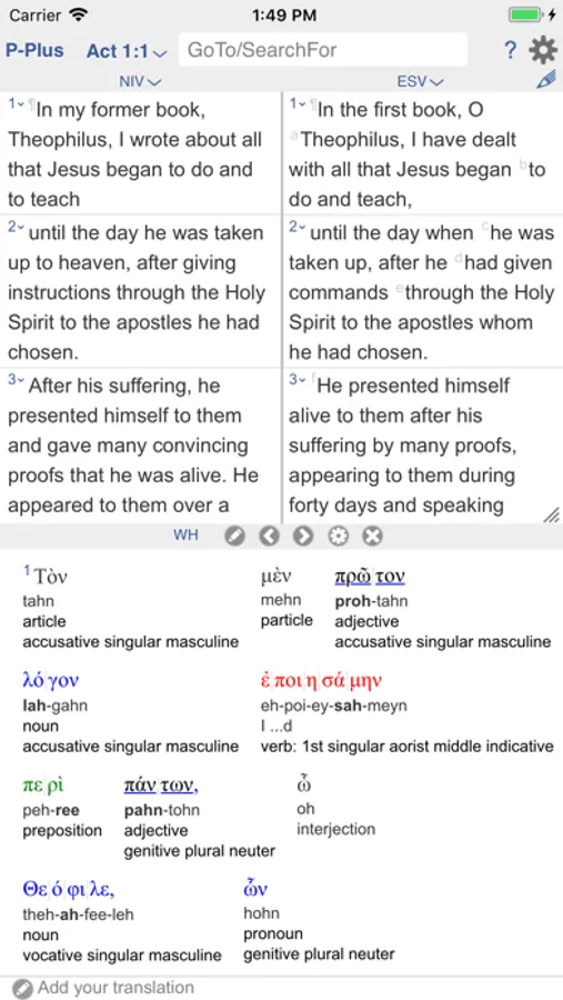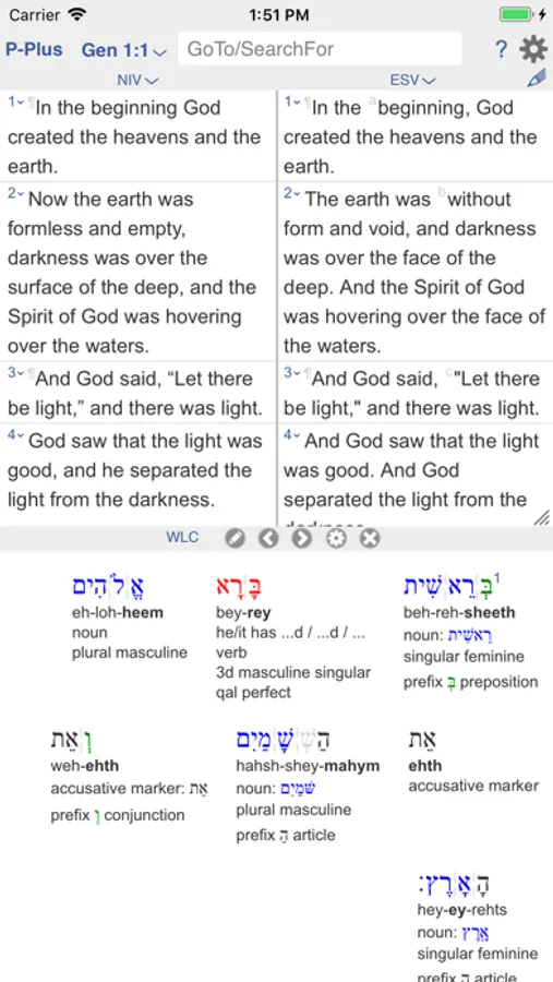 BIBLICAL LANGUAGES: See Hebrew and Greek in parallel with other versions. Plus tap any word to lookup the corresponding Hebrew or Greek word and its occurrences. Plus tap any verse to lookup Hebrew or Greek details in a verse: phonetics, parsings, parts of speech, translation tips.