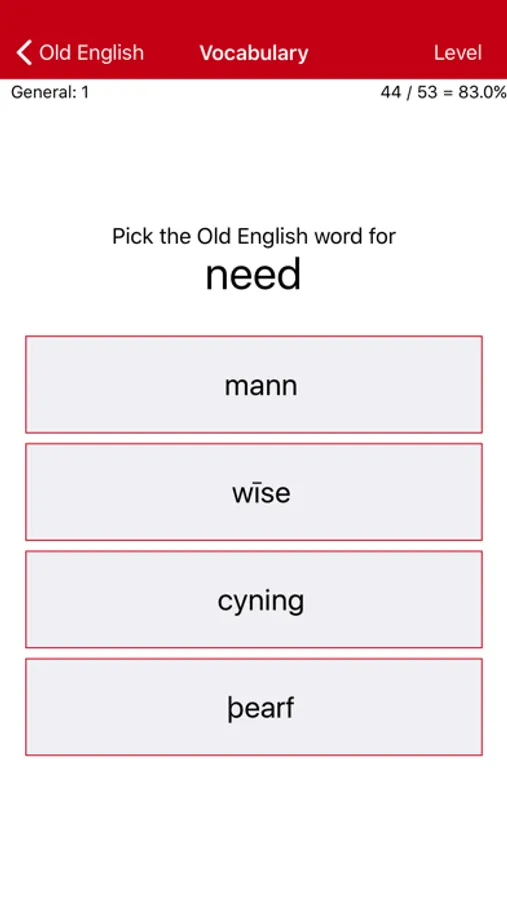• Vocabulary: 150 levels of general vocabulary, each testing the translation of 10 words between modern and Old English. A further 330 levels cover the vocabulary of Beowulf in approximate sequence. Interspersed among these are cumulative levels reviewing what has been learned earlier (giving a total of 542 levels).