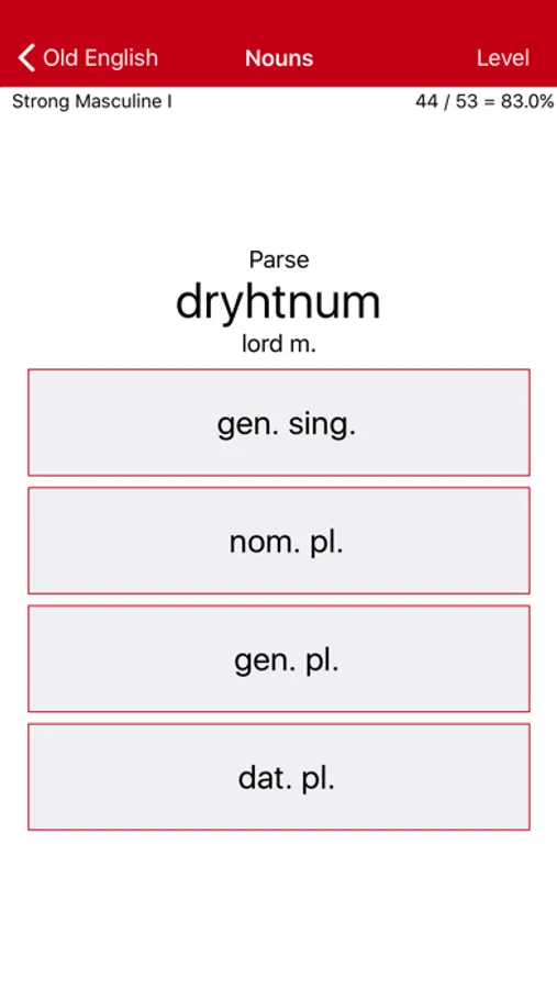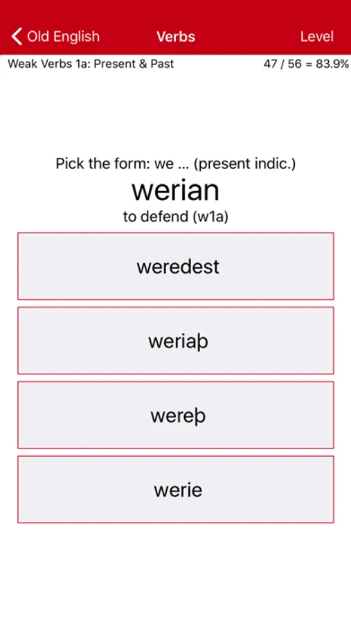 Wherever you have your phone handy, it is ready to drill you on Old English vocabulary and grammar with a continuous multiple-choice test. Your answers are immediately confirmed or corrected, and reinforced through repetition.