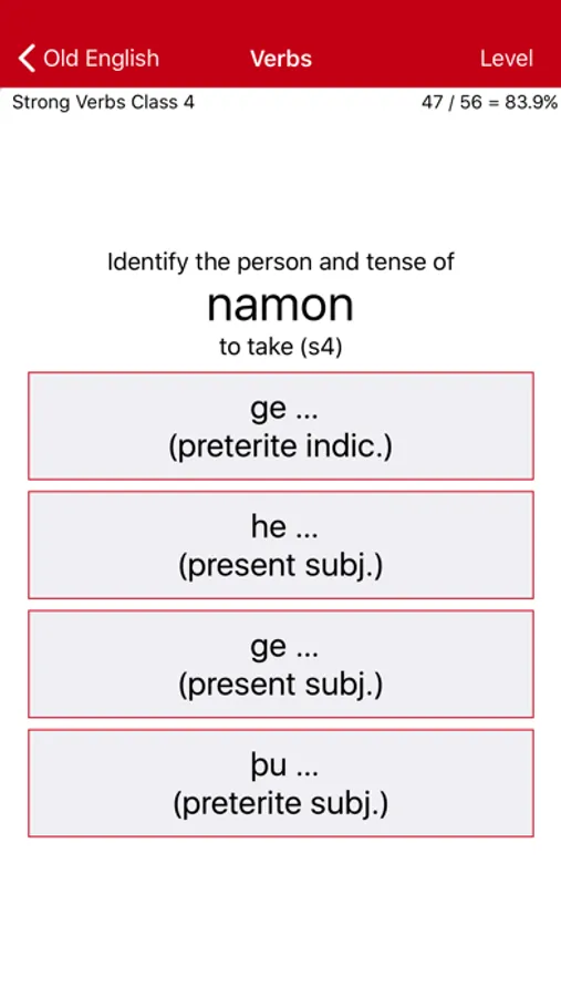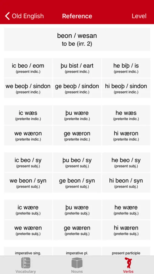 • Verbs: Tests your ability to parse and conjugate a full range of weak, strong, and irregular verbs in Old English.