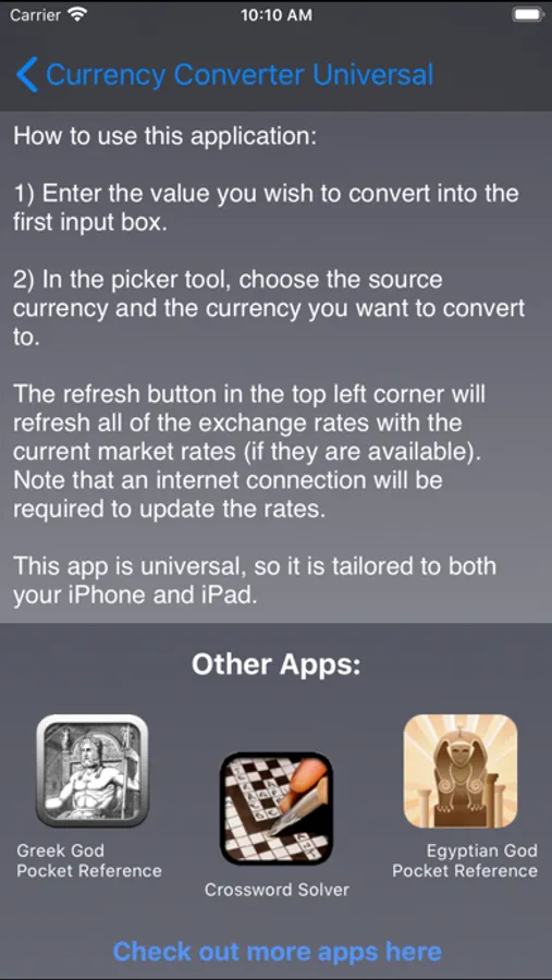 Currency Converter Universal is an easy to use currency converter for your iPhone, iPod Touch and iPad. One app for all of your devices. Great for quickly checking your currency values, for travellers, students or businesses.