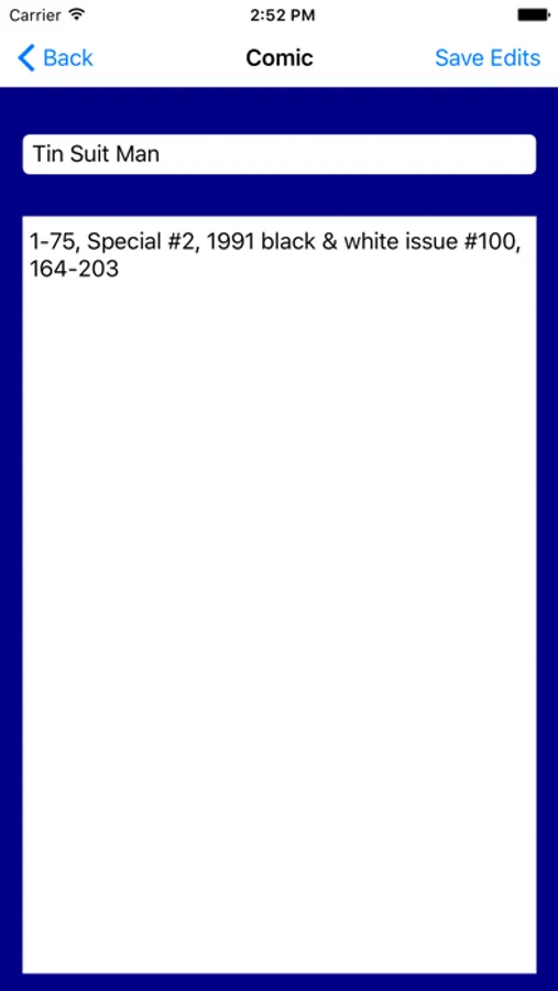 This app allows you to track what comics are in your collection, as well as what comics you want to buy. The open text areas allow you to mix words, issue numbers and any notes you might want to make about a title. Write your list your way.