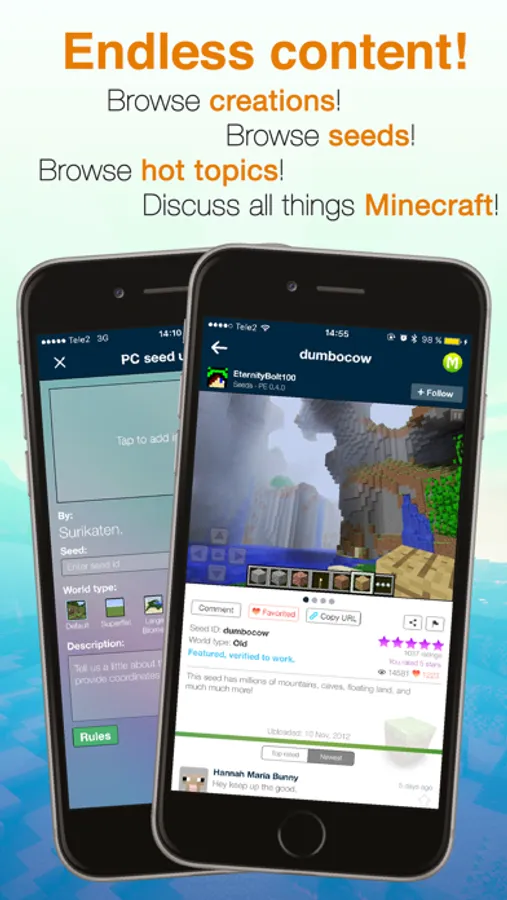 Have you ever gotten bored with a map on Minecraft? Ever wanted to explore something new and beautiful or epic? This app will constantly provide you with awesome seeds worth checking out. Check them out now!