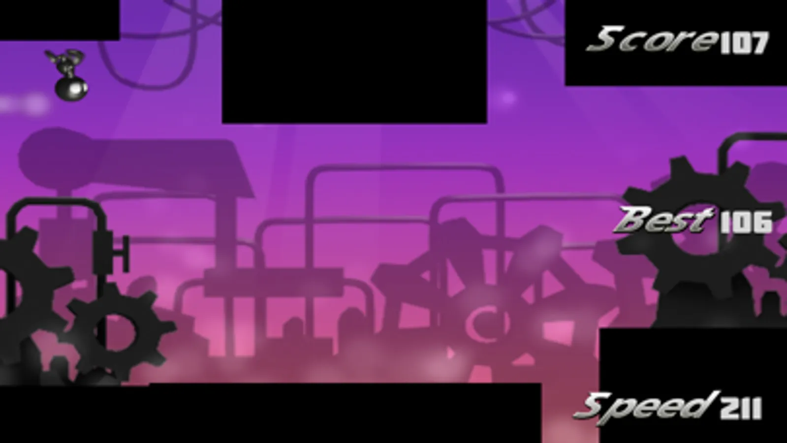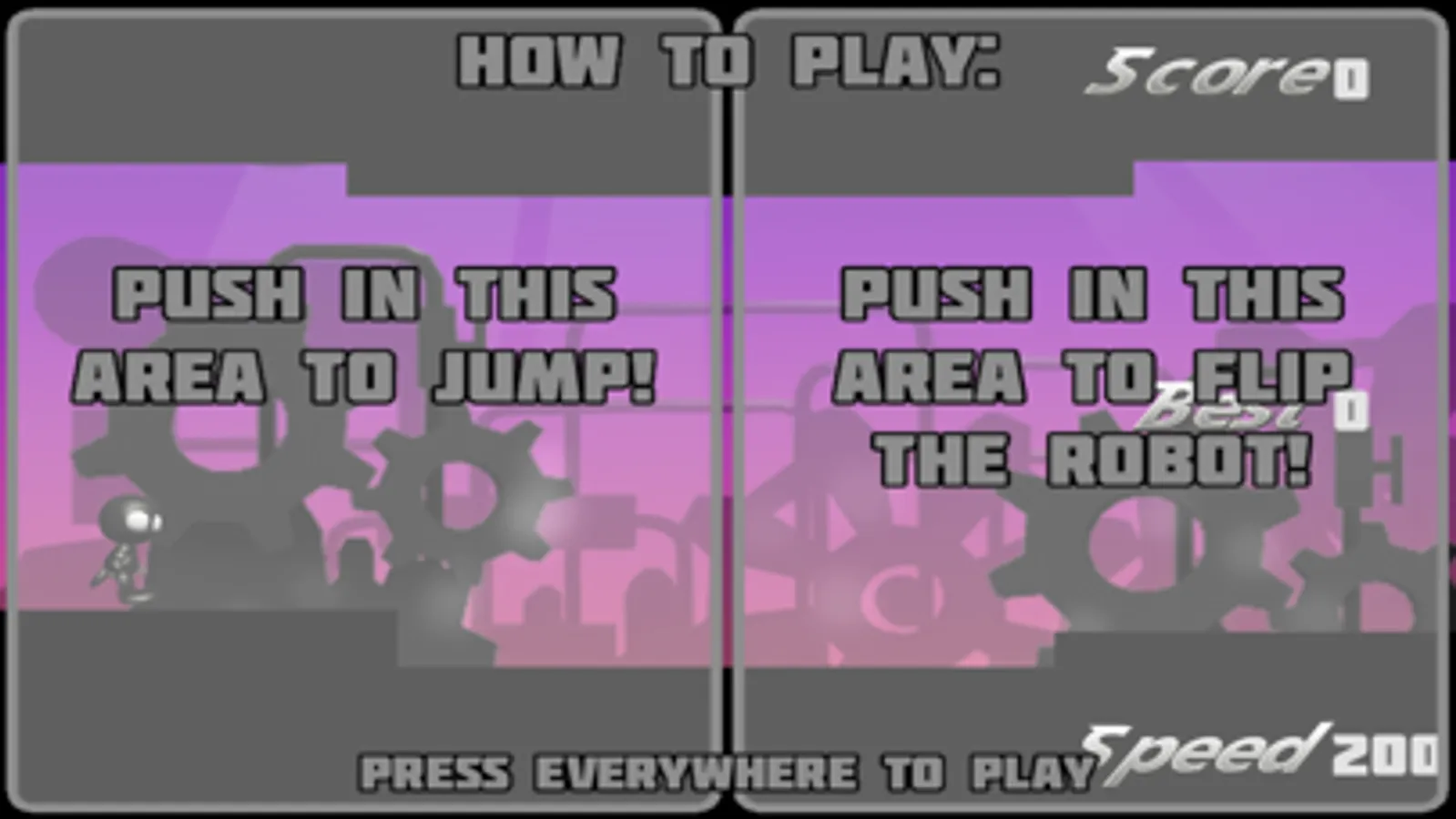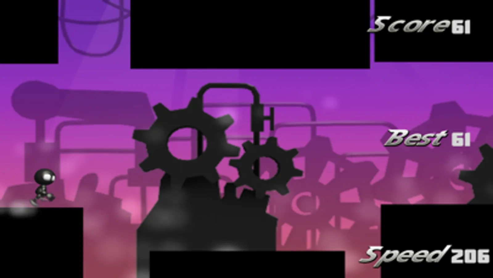 Your robot is able to jump the platforms with incredible leaps but is also equipped with a "G" device capable of reversing gravity! you find yourself running upside down! use this trick to avoid the big obstacles you encounter on your ride.