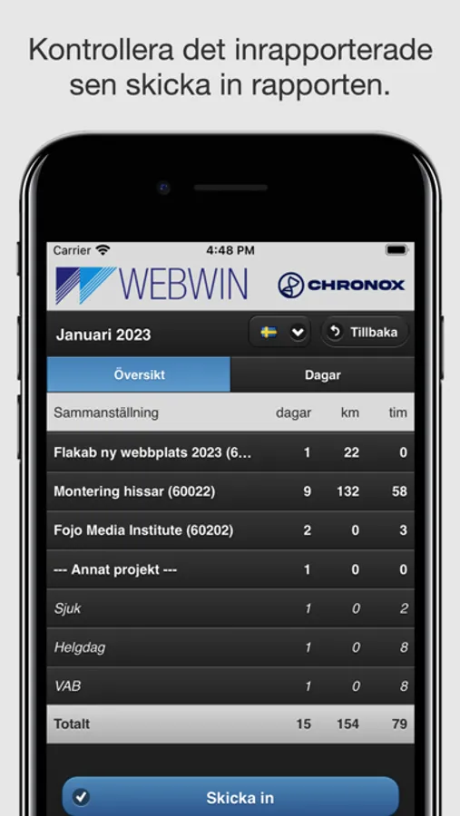 Chronox Tidrapportering är ett enkelt och modernt tidrapporteringssystem för små och medelstora företag. Det är utvecklat för att göra arbetsdagen mer effektiv för användaren och lätt kunna hålla ordning på tider, personal och arbetstimmar.