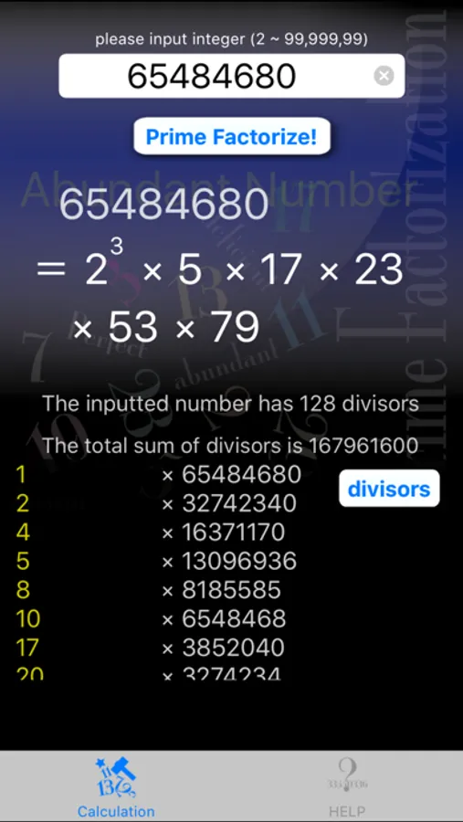This app factorize inputted integer to primes. You can input and factorize any integers under 100 million.