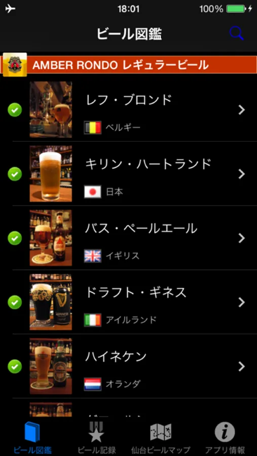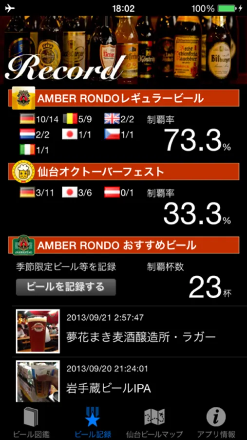 ビール図鑑の制覇状況を表示します。ビール制覇率100%を目指して、頑張ってくださいね(飲み過ぎにはご注意を)。制覇の暁には特典をご用意しております。