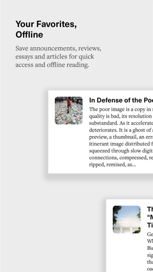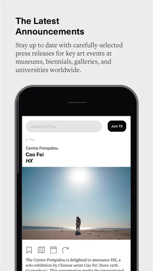 The e-flux app for iPhone and iPad includes content from across our publishing network: full issues of the e-flux journal, art-agenda reviews, essays on architecture, podcasts, and carefully-selected announcements for key events at museums, biennials, galleries, and art schools worldwide (and near you).