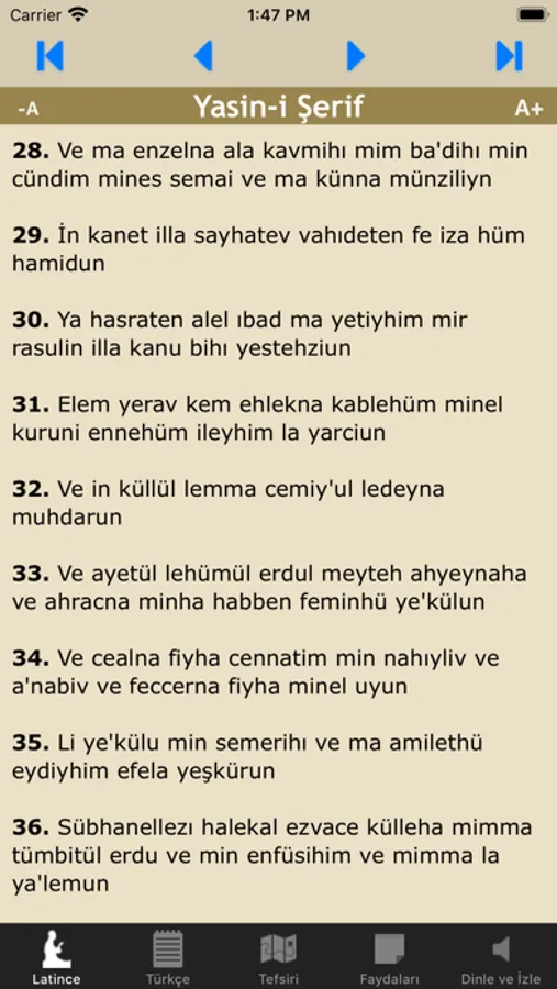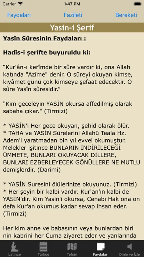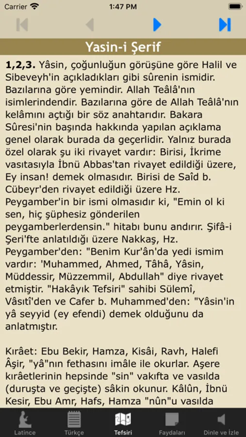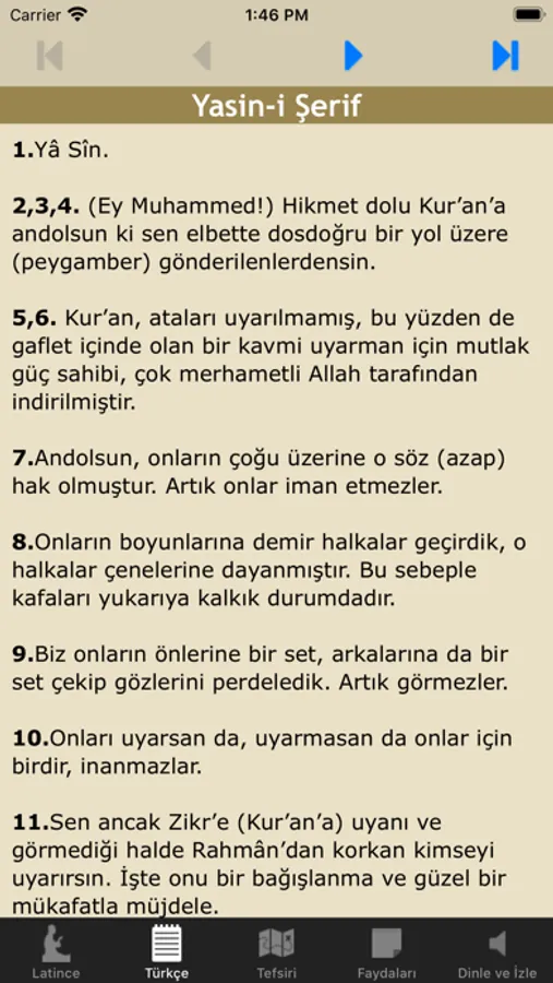 √ Kuran’ın kalbi sayılan Yasin-i Şerif'in Latince'si, Türkçe'si, Tefsiri, Arapça'sı ve ok işaretli olarak Türkçe mealli okunuşunu dinleyebilir takip edebilirsiniz.