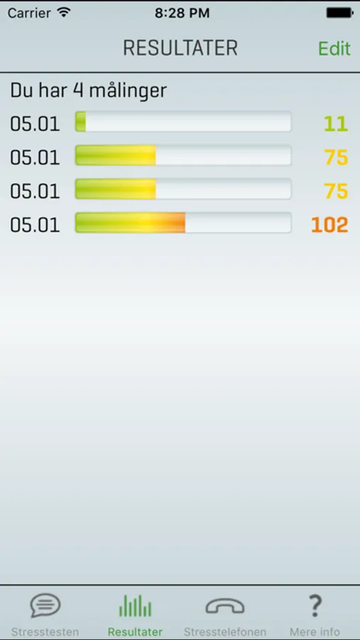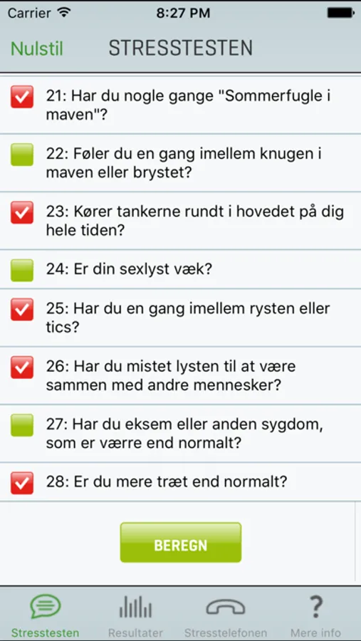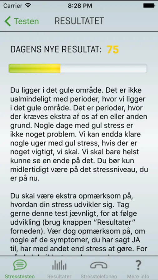 Stresstesten er en app, hvor du kan finde dit stressniveau ud fra et spørgeskema. Resultatet består dels af en værdi og dels af en beskrivelse. Resultaterne af stresstesten gemmes, så at du kan følge udviklingen.