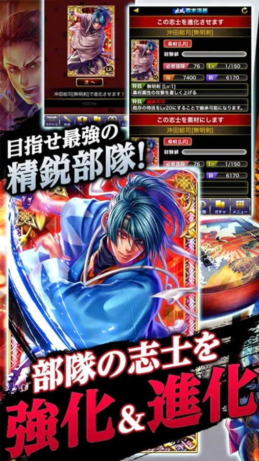 異なる志士同士を合成し「強化」することで志士の能力を上げたり、
