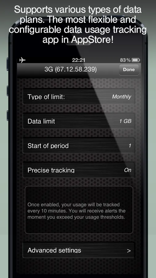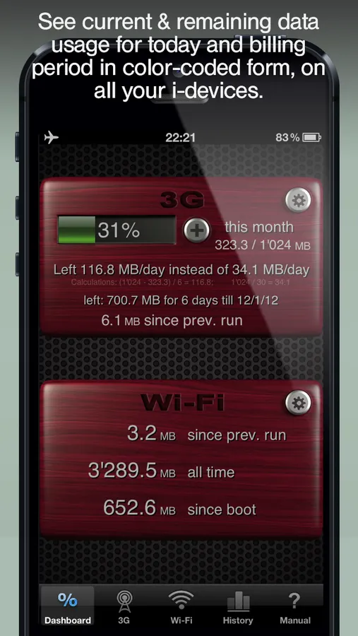Just enter the data limit of your plan along with the first day of the billing cycle, and the app will notify you automatically when you reach important levels of your data usage limits (e.g. 90%, 100%). Stay within your limit and never pay extra overcharges again! It will also show you the percentage of the data limit that you've already consumed on the app icon!