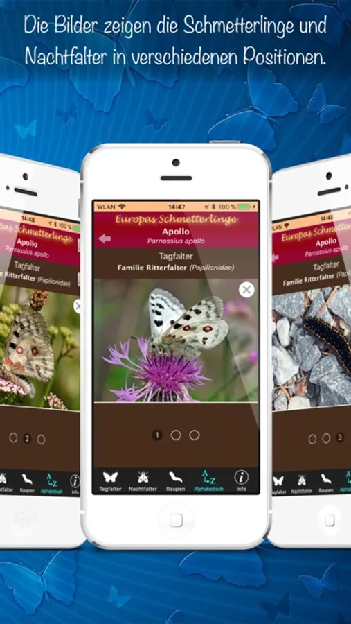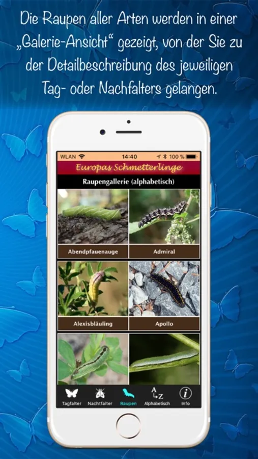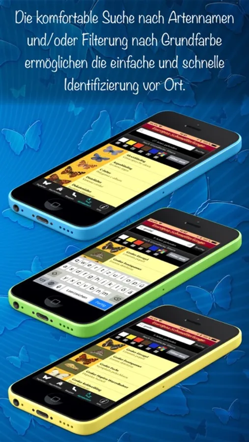 Die komfortable Suche nach Schmetterlingsnamen und/oder Filterung nach Grundfarbe der Falter ermöglicht die einfache und schnelle Identifizierung vor Ort.