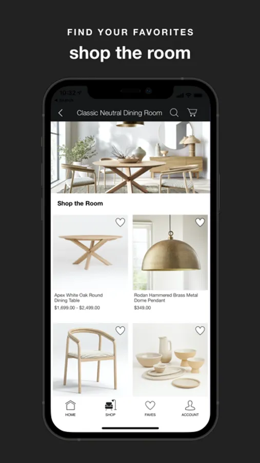 • Shop our full collection of furniture, housewares and kids products—everything sold online is now available in the app.