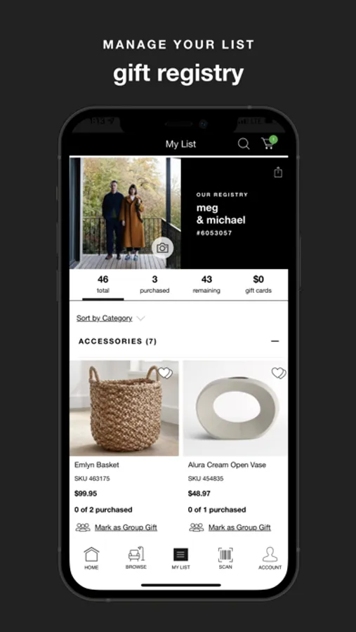 • Create and edit your wedding registry, baby registry, or gift registry with ease and see purchases made from your registry in real time.