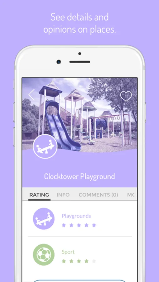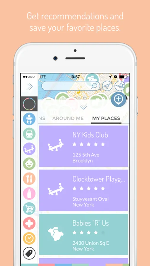 Places that are top rated by other parents or places nearby are shown in our smart lists. On top of that you can save your personal favorite places in a list called „my places“ to make sure you always have them on hand.
