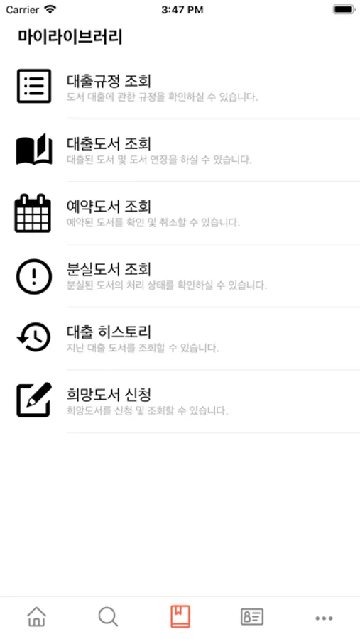 조선이공대학교 도서관의 도서 정보 조회 및 대출정보, 희망도서를 신청 할 수 있는 아이폰용 모바일 어플리케이션 입니다.