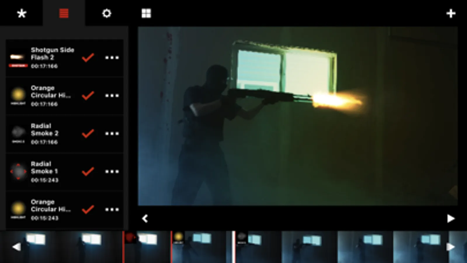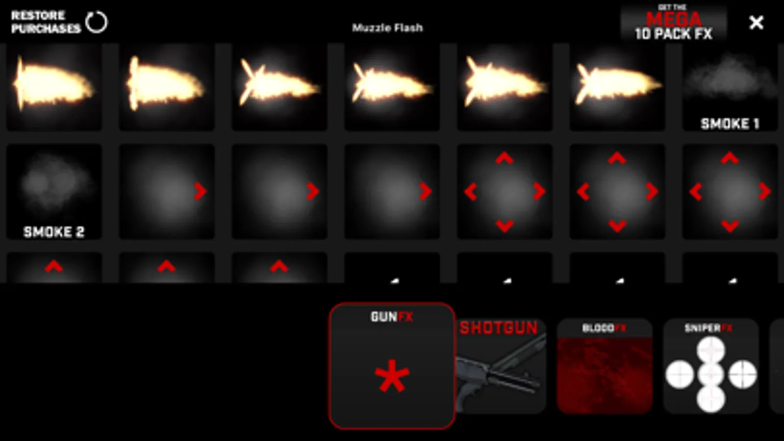 Position gun flashes and other effects quickly and easily with our simple effects editor. Other effects in this app include sniper scopes, first person shooter flashes, simulated night vision, blood spray and splatter, lasers, bullet hit effects, flying shells, smoke bursts and many different movie sound effects.