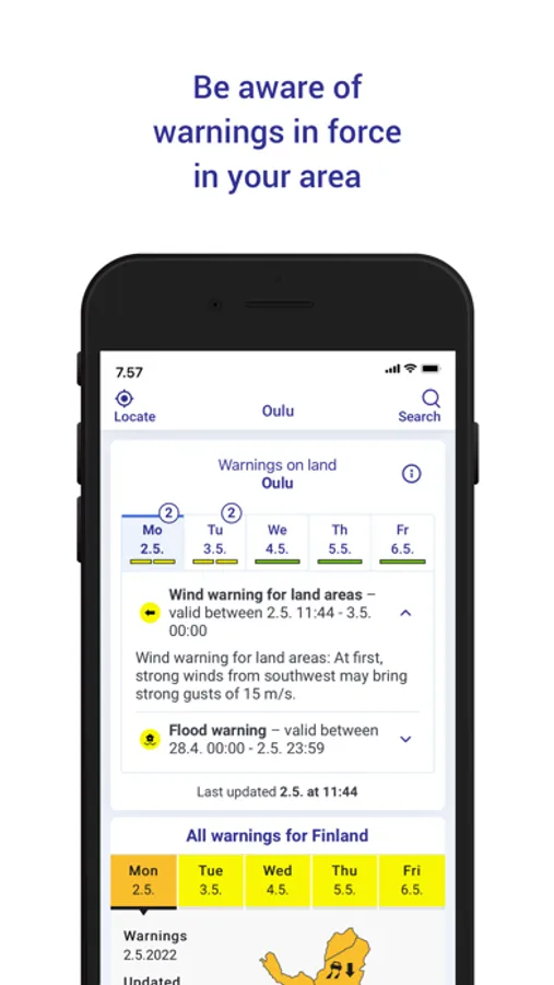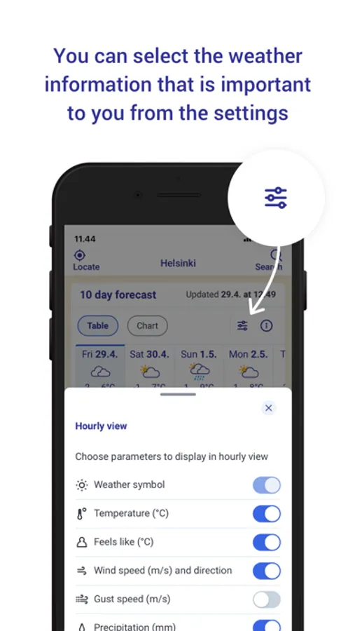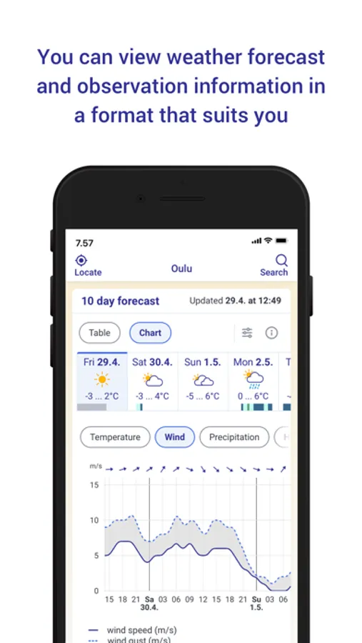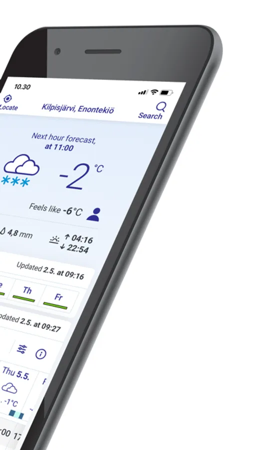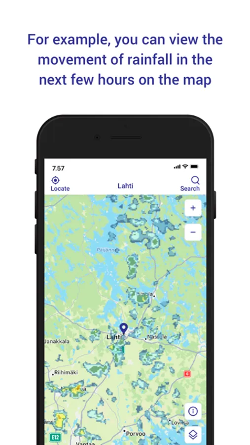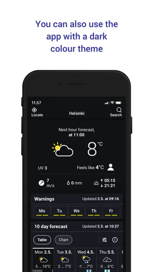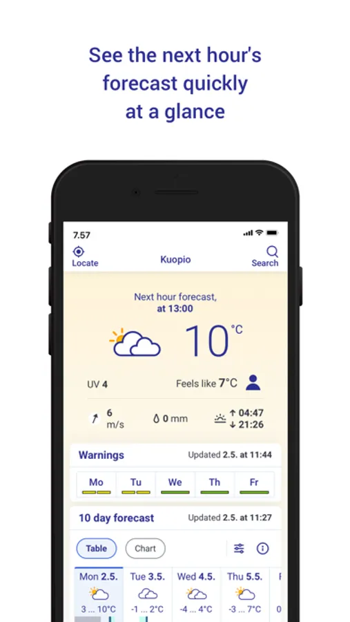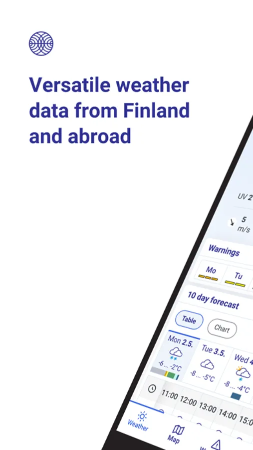 Our Weather app provides weather information for almost all Finnish municipalities. If you enable location on your phone, the service will automatically show your location forecast for up to 10 days. Are you only interested in temperature or do you also want information about pressure, wind gusts or the UV index? Both weather forecasts and weather observations allow you to choose which weather data you want to see. You can also save your favorite locations in Finland and abroad on the app and browse them easily. The information is available as tables and graphs. The animations in the map section allow you to follow, for example, the movement of rainfall areas, and the rain forecast based on radar images shows the direction in which rainfall areas will move in the coming hours. The service displays current weather warnings at your chosen location and you can also easily check official weather warnings throughout Finland.