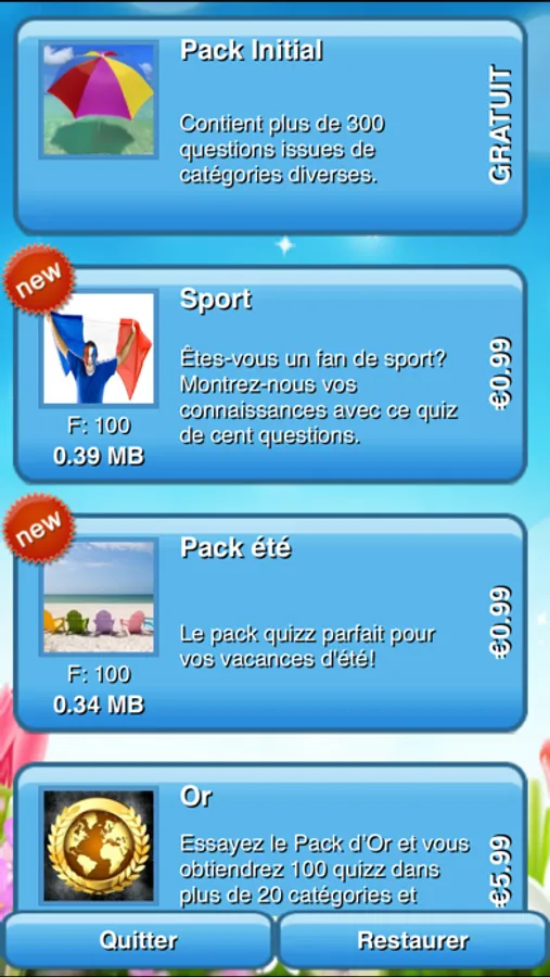 Jeu de culture générale où vous pouvez choisir parmi un certain nombre de quizz de différentes catégories et répondre à des questions.