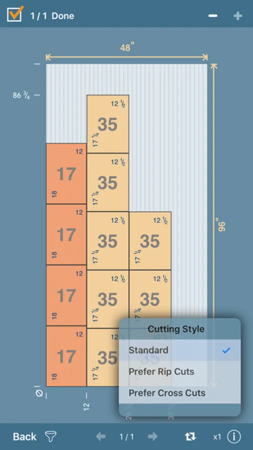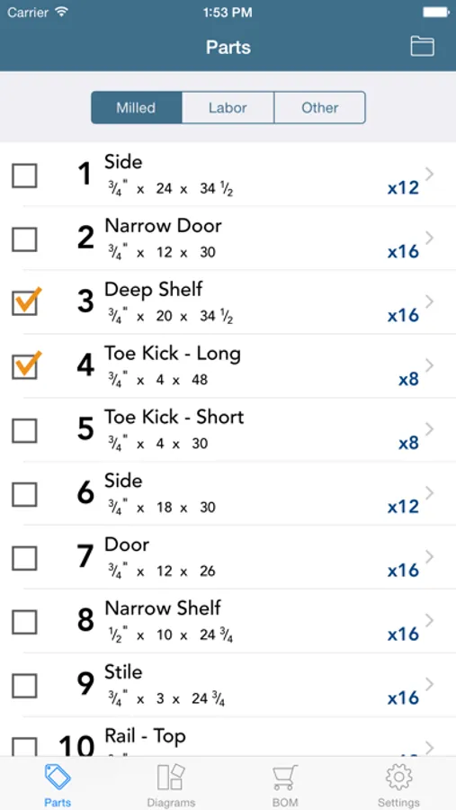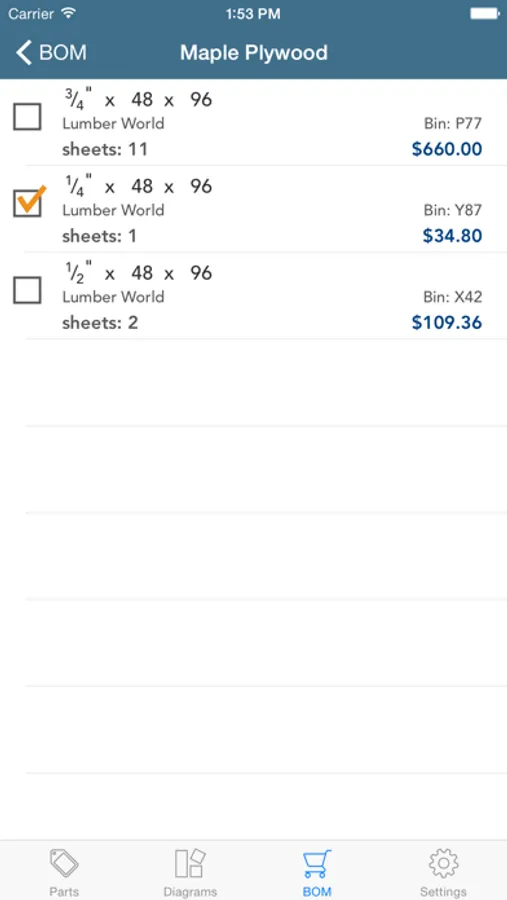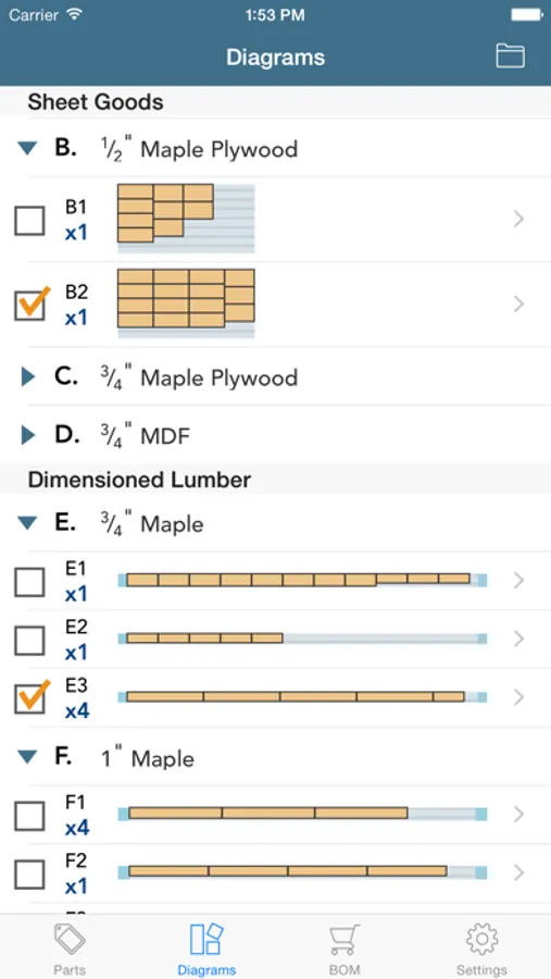 Browse your cutting diagrams, parts lists and bill of materials one the go. Check boxes let you keep track of which diagrams have been cut, which materials have been purchased, and which parts are finished.