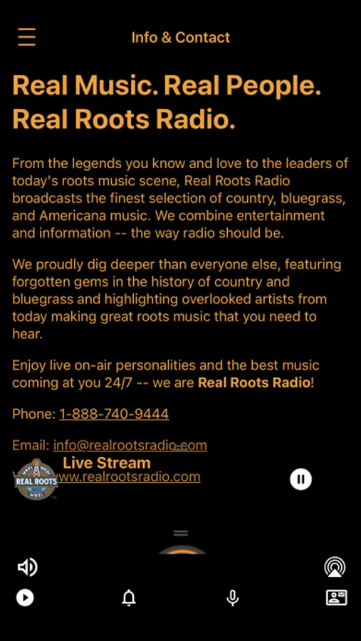 Enjoy live on-air personalities and the best music coming at you 24/7 -- we are Real Roots Radio!