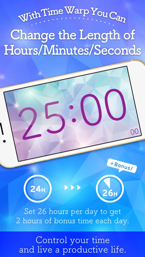 If you set a day to 26 hours, the length of one hour will be 5 minutes shorter than usual. By putting this clock in a place where you can see it, you will be able to spend your time efficiently in a natural way. After 24 hours, you will get 2 hours of bonus time. This means that the short times you save will be combined to make more meaningful time.