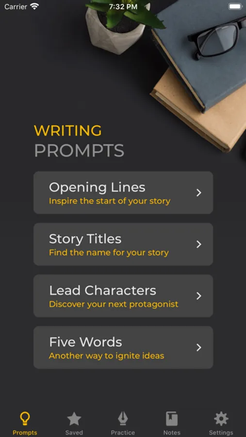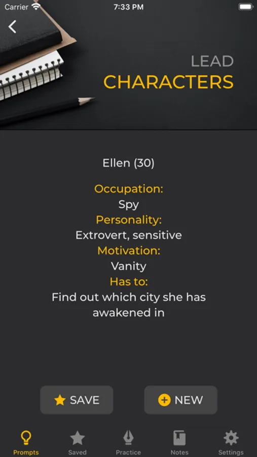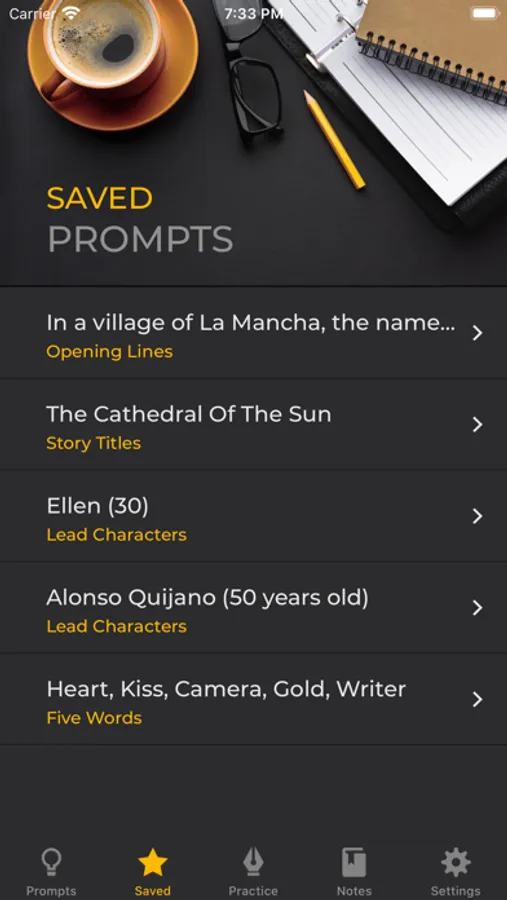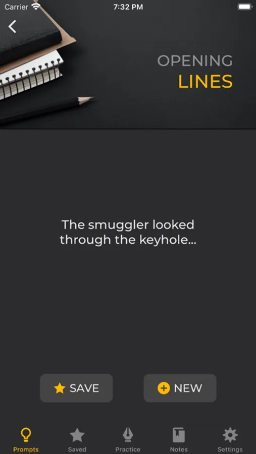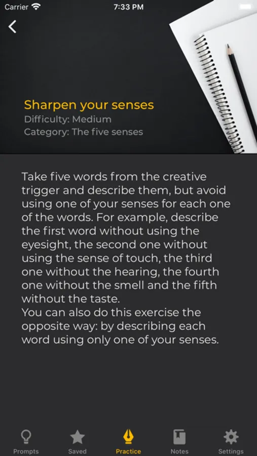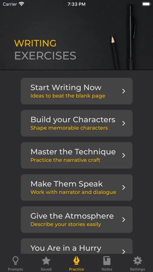 A complete writing workshop with a lot of exercises organized by category and difficulty, for you to improve your writing and get the most of the creative triggers in the app.