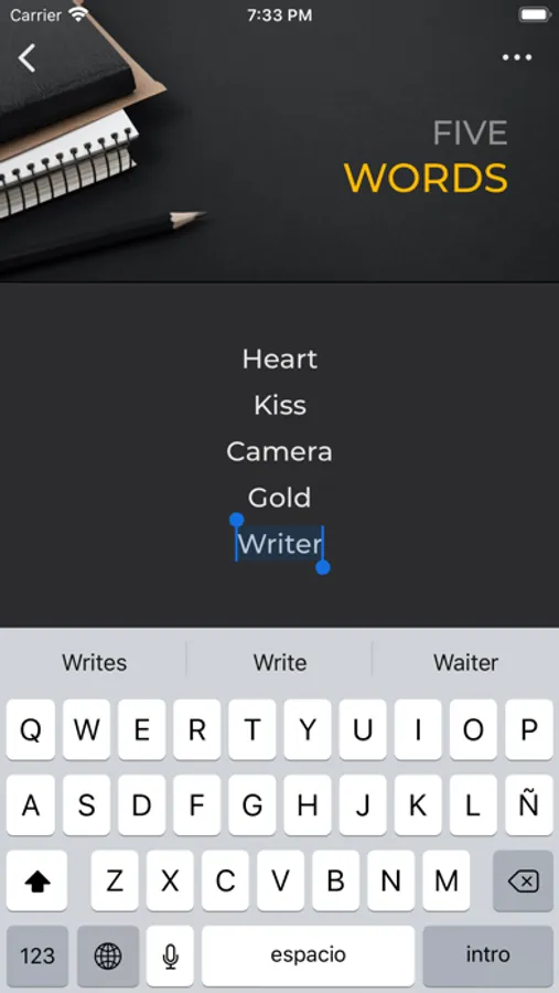 A generator of five random words for you to get inspired before your daily writing and to use as a start point in some exercises of the app.