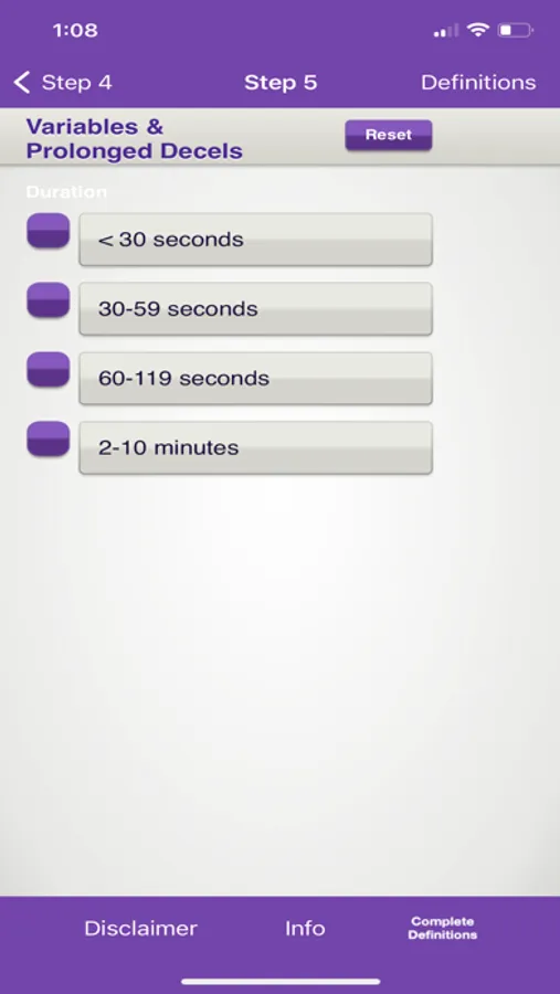 When using the FHR 5-tier app it is not necessary to refer to any other table or chart. Variability and baseline, and the shape, nadir, and duration of decelerations are entered with buttons on the consecutive screens. The app calculates the severity of the deceleration and the color for each tracing. All aspects of the tracing are summarized on the colored results screen, so that the user can quickly communicate with others.