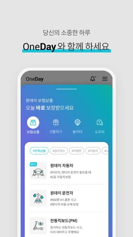 자동차보험, 운전자보험을 비롯해 국내여행, 귀가안심, 레저, 백신 보장 등 다양한 미니 생활보험들을 일상에서 쉽게 마주치는 위험으로부터 안전하게 보호 받을 수 있습니다. 또한 친구와 가족들에게 보험을 선물 할 수도 있어 편리성과 합리성을 다 갖추었습니다.