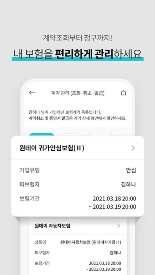- 가입 완료된 원데이 보험상품에 대한 계약조회 및 선 취소 기능