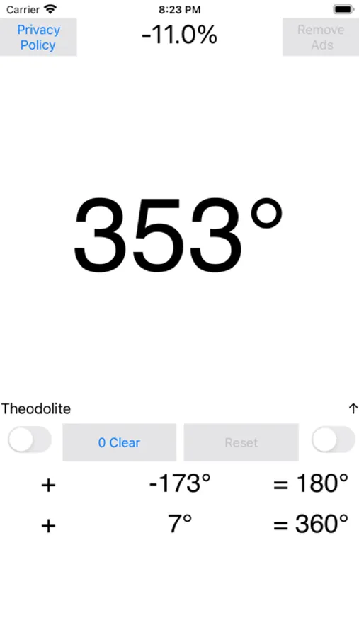 Simple tilt angle protractor free application that can easily measure tilt simply by tilting the device. The angle of inclination measured from 0 degree to 359 degrees, converted gradient (%), angle at which sum is 180 degrees / 360 degrees are displayed at the same time. You can switch to the theodolite, the specified angle can be set to 0 degree. ( 45 Degrees = Gradient 100 % )