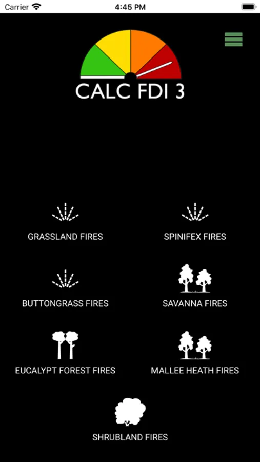 CALC-FDI3 is designed to be used in Australia by Bush Fire Control Officers and members of Bush Fire Brigades. It makes use of the Australian Fire Danger Rating System models to predict fire behaviour for fires in the following environments: Grassland, Mallee Heath, Shrubland, Tasmanian Buttongrass, Spinifex and Spinifex Woodlands and Savanna Woodlands and Eucalypt Forests.