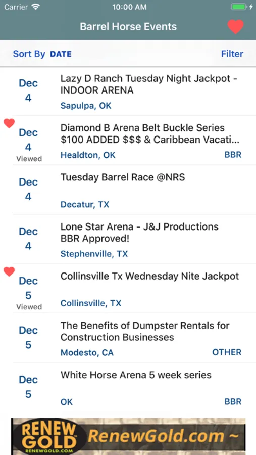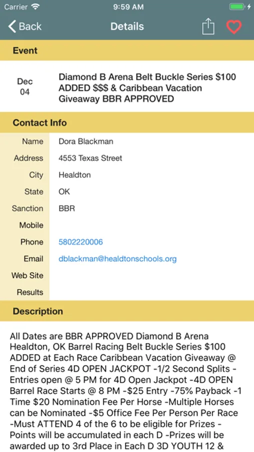 Find upcoming events for barrel horse races, rodeos and clinics. Each event includes description and contact information. Filter by date, sanction, and state to find events in your area. Save your favorites to easily find them again