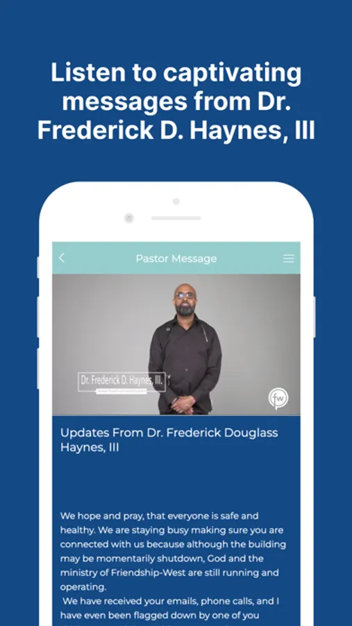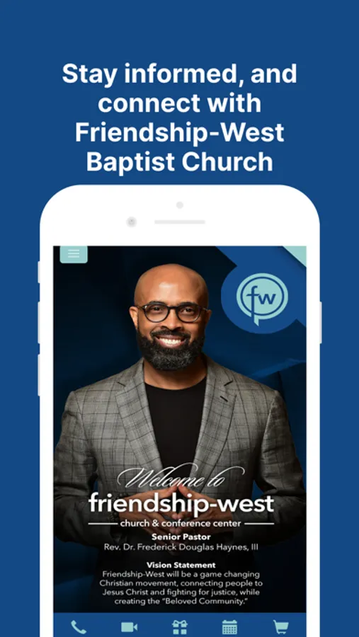 The Friendship-West Baptist Church App will allow you to experience the cutting edge ministry of pastor, captivating orator, educator and activist, Dr. Frederick D. Haynes, III. Right at your fingertips you will have access to live motivational Sunday worship services, revivals, and on-demand messages. You can access timely devotionals to empower you daily. You will be informed and challenged to engage in our ministry’s fight against social injustice by one touch of our “Act Now” tab. You can grow spiritually through reading God’s word. You will always know what’s going on at Friendship-West. If you are in need of prayer, you can post it on our prayer wall where thousands of members and visitors can pray for you and your situation. You will have evangelism tools at your fingertips to share the ministry of Friendship-West through Facebook, Twitter and YouTube. No matter where you are in the world, you can stay connected to us through worship, prayer, giving, and sharing your stories and photos. More importantly you can help us spread the gospel of Jesus Christ!