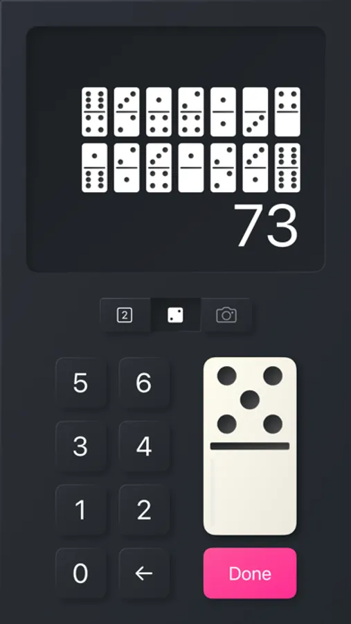 Note: Camera and domino modes only support the double-six domino set (suits from 0 to 6). Camera mode only supports black pips on white dominoes.