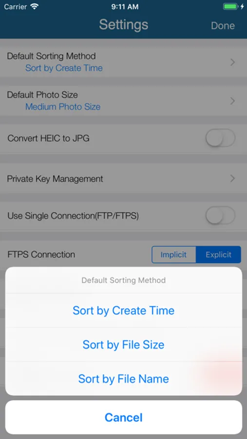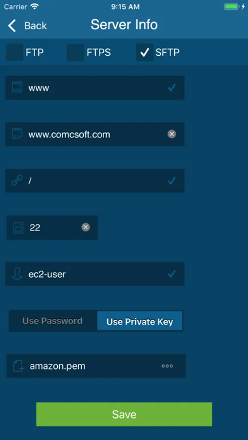4. Support both user name/password and Private Key authentication for SFTP. Support both PPK and PEM keys. Support importing keys from/exporting keys to iCloud Drive under iTransfer/keys folder.