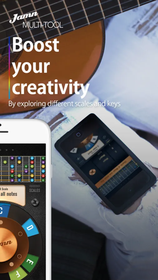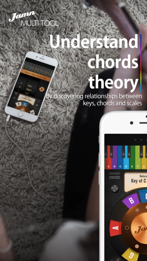 The app is the perfect companion to visualize a song’s hidden structure and chord progressions. The Jamn wheel that confers the app its uniqueness, reveals the relationships between keys, chords and scales for guitar (electronic guitar and acoustic guitar), bass, ukulele and piano. Re-discover the circle of fifths with Jamn multi-tool.