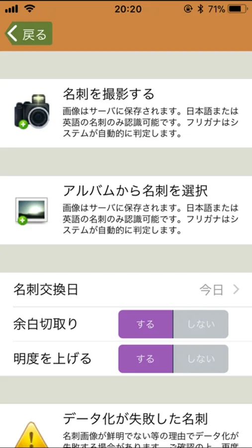 MOT/Cloudに名刺データをアップロードする際に、名刺画像の余白の切り取り、明るさ補正を行えます。