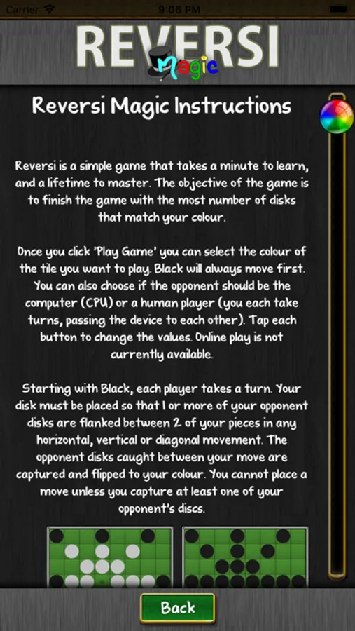 Reversi (also known as Othello) is a classic board game that has been played for generations. Take it with you in your pocket! Flip your opponents disks to your color to win. Compete against the computer or another human player.