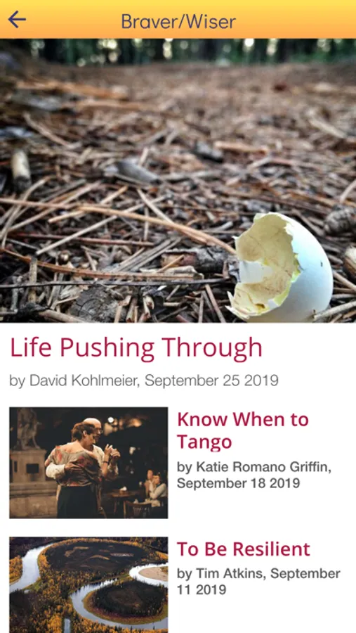 Users can mark favorite items for offline access or share them with friends and family. The app also features an image gallery of shareable graphics and weekly Braver/Wiser reflections.