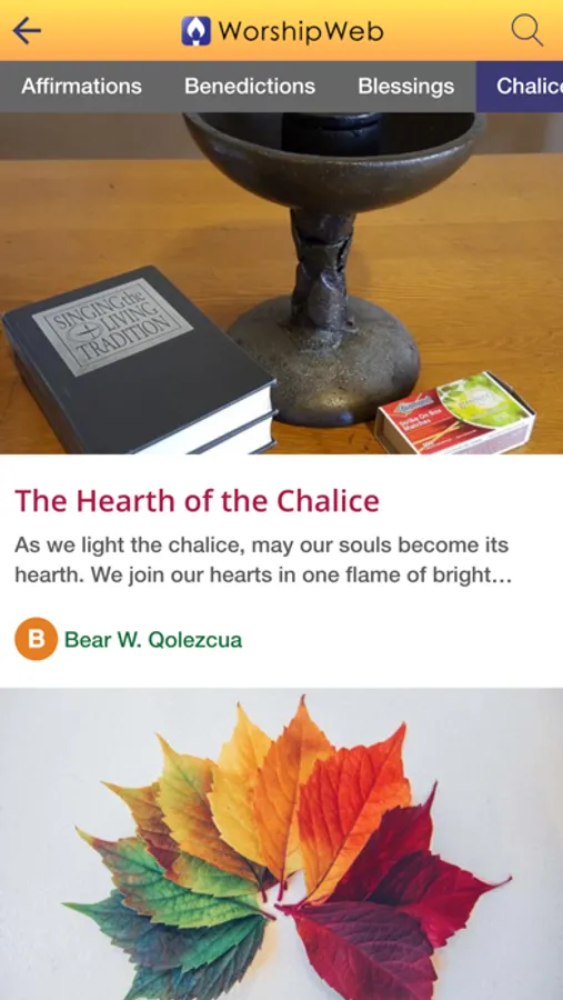 The app offers access to hundreds of inspirational words covering a range of topics, including: Affirmations, Benedictions, Blessings, Chalice Lightings, Closings, Invocations, Litanies, Meditations, Openings, Poetry, Prayers, Readings, Responsive Readings, Rituals, and Stories.