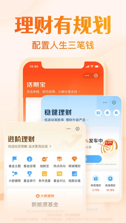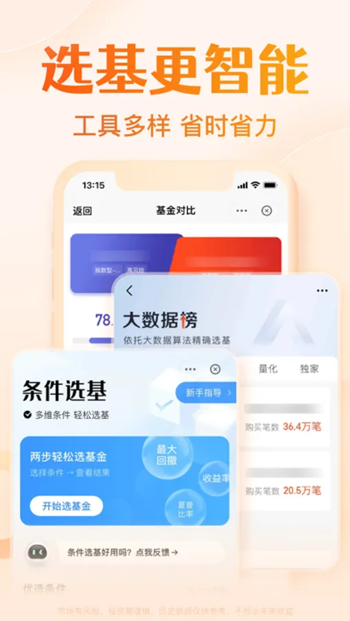3. 基金优选:汇集中风险以上的股票型基金、指数型偏股基金、混合型偏股基金、QDII等产品;