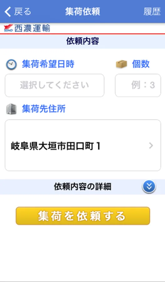 集荷希望日時、個数、集荷先住所を指定して集荷の依頼ができます。