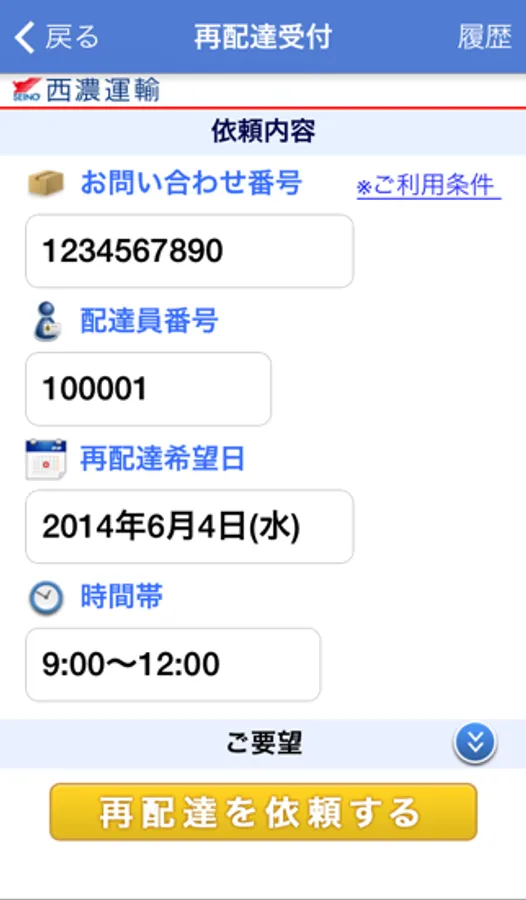 ご不在連絡票のお問い合わせ番号と配達員番号を入力して、再配達の依頼ができます。