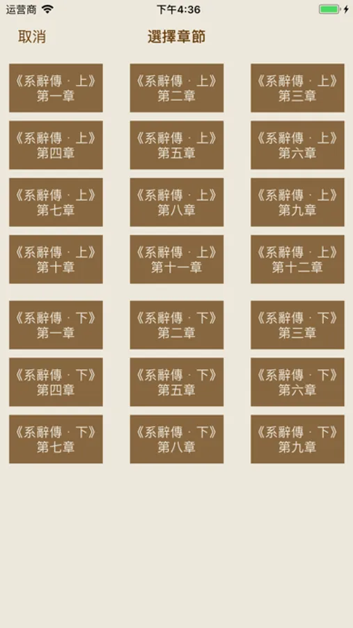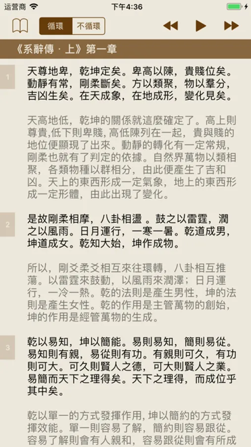 本软件的朗读及翻译功能旨在帮助学习者欣赏,理解《系辞传》从而从哲理上把握《易经》。