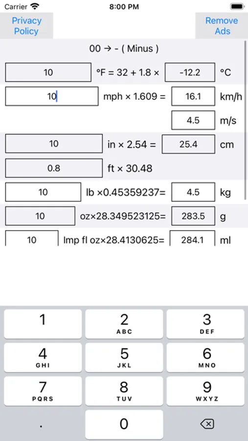 A simple unit conversion calculator free app that displays the unit conversion result just by input numbers such as temperature and speed. Conversion of temperature, speed, length, weight, capacity. Fahrenheit(℉)-Celsius(℃), miles per hour(mph)-kilometers per hour(km/h)-meters per second(m/s), feet(ft)-inches(in)-centimeter(cm), pounds(lb)-kilogram(kg), ounce (oz)-gram(g), fluid ounce(fl oz)-Milliliter(ml)